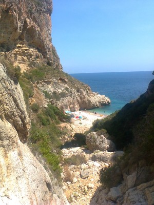 Nosotros no conseguimos acceder a la cala, pues el segundo tramo de cuerda no lo veíamos claro luego para subir, se nos iba a quedar una persona «colgada», pues ya digo que se necesita cierta forma física. Aparte, cuando divisamos la cala nos llevamos cierta desilusión pues había unos acampados textiles que se habían asentado allí con las tiendas, música, patines, etc.. Total, que advertimos que quizá el acceso a la cala en condiciones de buena mar mucho mejor en temporada de verano alquilando un patín o una piragüa en la cala Moraig, si no quieres acceder por la ruta de las cuerdas. Total que hicimos de tripas corazón y nos volvimos a la Cala del Moraig donde después del palizón de subidita nos dimos una merecida siesta (con bañador, eso sí) 😦