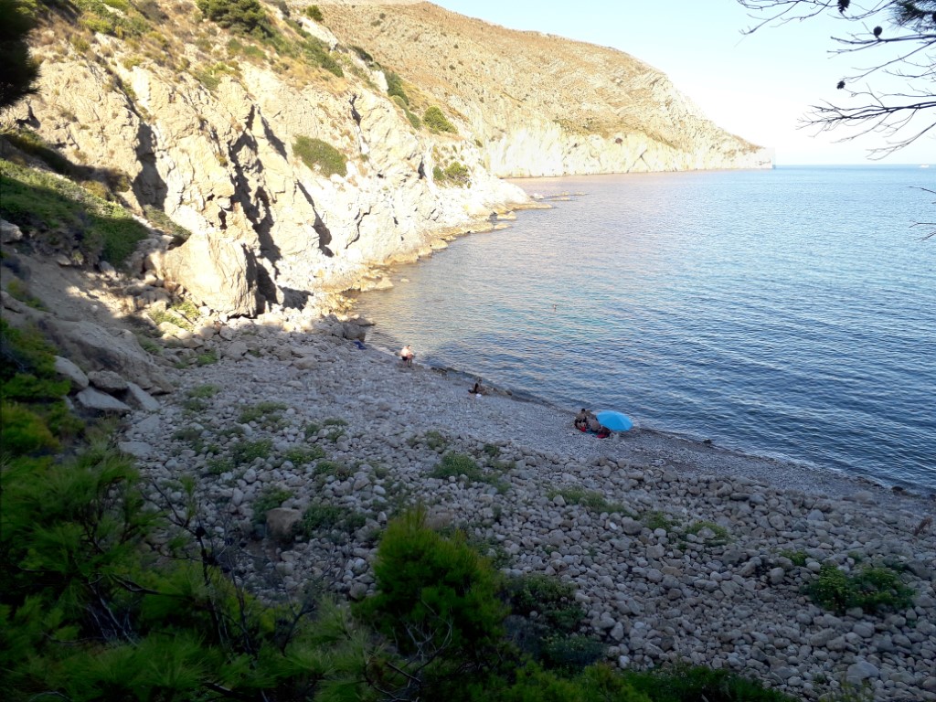 Esta es la primera que visitamos, ya que íbamos en dirección a Benitachell. Cala semiurbana ubicada cerca del restaurante Mena, dirección Denia-Urbanización Les Rotes. Fuimos un sábado a echarle un vistazo, pero al ser semiurbana no íbamos muy convencidos. Además las calas cercanas estaban llenas de textiles en pleno sábado de Julio.
