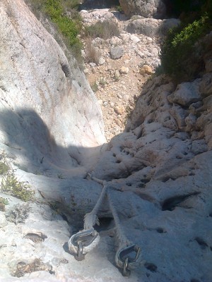 Os adjuntamos fotos de esta ultima cala Els Testos, una foto general vista desde el camino en el punto del segundo tramo de cuerdas y foto detalle de como son las cuerdas.