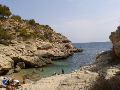 Naturista, de aguas tranquilas y cristalinas y en un entorno inmejorable (… bueno, yo apagaría la música del chiringuito, en mi opinión perturba la tranquilidad de la playa). Fuimos domingo y había gente, pero más nudistas que textiles. Os explico cómo llegar (es muy fácil) y a continuación dejo un enlace muy descriptivo que encontré.
