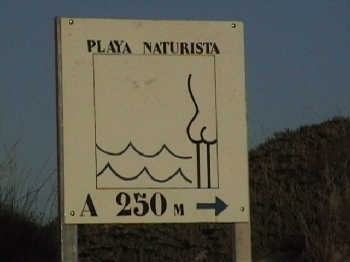 Ambiente: En Julio de 2004 pusieron carteles señalizando una zona de la playa como nudista, a partir de unos 500 metros a la derecha del acceso principal. Cuando llegamos aún no estaban puestos los carteles, y la gente se situaba más cerca del acceso que esos 500 metros. Yo diría que se empezaban a ver los primeros nudistas a unos 200 metros del acceso, justo a continuación del chiringuito y la zona de tumbonas. Lo que sí se nota es que a partir de esos 500 metros apenas hay textiles.