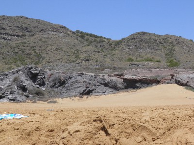 A unos 20 km de esta zona, cerca del comienzo de La Manga, está el parque natural de Calblanque, en cuyas playas es tradicional la práctica del nudismo (excepto en las zonas más cercanas a los aparcamientos). El paisaje es muy distinto, y merece la pena hacer una excursión, aunque los accesos son algo más complicados. Las playas del parque son de arenas muy rojizas, y en la que estuvimos, las rocas eran pizarras (negras), por lo que el colorido era bastante inusual y bonito.