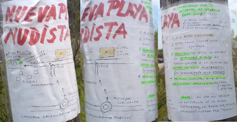 Hemos estado en la playa de Sant Llorenç en Cullera y al volvernos hacia el coche nos ha llamado la atención un cartel pegado con papel adhesivo transparente en un poste de madera, que indicaba la existencia de una nueva playa nudista en Valencia. Así es que como nos pillaba de camino nos hemos pasado, y cuál es nuestra sorpresa al ver que ciertamente se trata de una playa !!!!!!SEÑALIZADA POR EL AYUNTAMIENTO DE VALENCIA¡¡¡¡¡¡¡