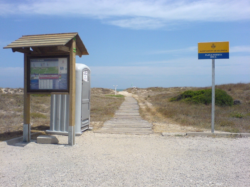 Para llegar está facilísimo. Solo tenemos que ir hasta el hotel Sidi Saler y tomar la carretera de la izquierda hasta el último bloque de apartamentos, y el aparcamiento justo enfrente del bloque 5 está señalizado como playa nudista. Tiene dos carteles, un aseo, un tablón caseta que indica que la playa es nudista en 800 metros (300 por un lado y 500 por el otro), una ducha, acceso con tablones que permite el paso de una silla de ruedas, y dos socorristas de la Cruz Roja. Al acceder a la playa ¡¡¡¡ ni una sola persona desnuda!!!!! pero si mucho textil, pero eso es lo de menos ya que al ser nueva está sin colonizar.